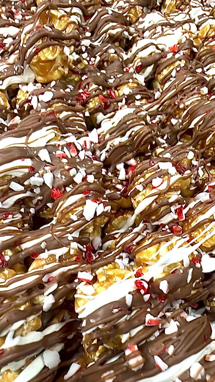 Generously showered each piece with silky milk chocolate and crisp white peppermint chocolate.